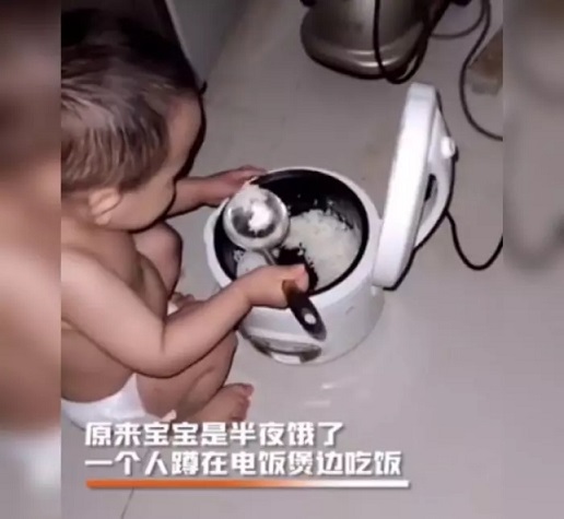 一位寶爸半夜醒來,發(fā)現(xiàn)寶寶不見了,急忙起來尋找,最后卻發(fā)現(xiàn)寶寶蹲在了客廳的電飯煲前,拿著勺子,在盛飯吃。原來這個寶寶半夜被餓醒,沒有哭鬧,而是自己穿著紙尿褲爬下床,爬到客廳去找吃的。