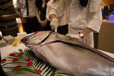 金槍魚肉質柔嫩、鮮美,蛋白質含量很高,富含DHA、EPA等具有生物活性的多不飽和脂肪酸、?;撬?、礦物質和維生素的含量豐富,是國際營養(yǎng)協(xié)會推薦的綠色無污染健康美食。