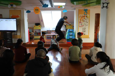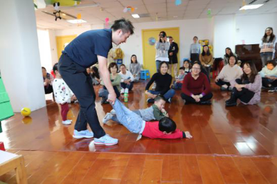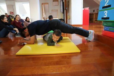 現(xiàn)場,潘教練示范了幾組不需要特定道具和場地,父母就可以在家中同時與寶寶開展的體育活動。潘教練表明,父母自己其實就是一個大玩具,可以通過不斷調整動作和身體的高度,讓小朋友實現(xiàn)訓練腿部力量、手部力量以及身體平衡、手眼協(xié)調、摔倒后的應對方式等能力。