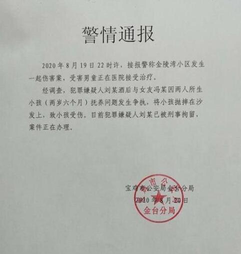 經(jīng)調(diào)査,犯罪嫌疑人劉某酒后與女友馮某因兩人所生小孩(兩歲六個月)撫養(yǎng)問題發(fā)生爭執(zhí),將小孩拋摔在沙發(fā)上,致小孩受傷 。