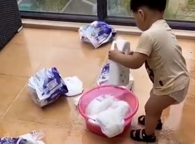 視頻中,爸爸去陽臺查看孩子在干什么。結(jié)果嚇了一跳,寶寶把家里所有紙尿褲都掏出來了,正一批一批放在洗衣機(jī)里洗。