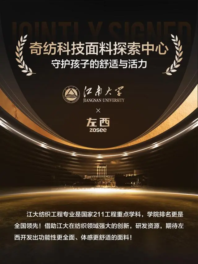 作為國貨童裝品牌,左西始終堅(jiān)持品牌沉淀與面料研發(fā)創(chuàng)新,以高品質(zhì)、多功能、價(jià)格合理的產(chǎn)品滿足不同年齡段、不同需求兒童的日常、戶外穿著需求。今年,左西童裝攜手江南大學(xué)創(chuàng)立“奇紡科技面料探索中心”,左西不僅提升了產(chǎn)品的舒適度和安全性,更贏得了消費(fèi)者的廣泛認(rèn)可。