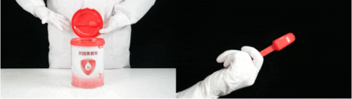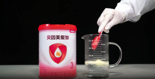 在開始沖調(diào)之前,我們先查看了貝因美愛加的罐體沖調(diào)方法說明,其沖調(diào)水溫建議為50℃左右,205ml溫開水加7平勺奶粉,約為每30毫升溫開水加1平勺奶粉,1平勺奶粉克重約4.5g。按照該沖調(diào)建議,我們采用了奶粉智庫專屬的“仿真沖調(diào)標(biāo)準(zhǔn)”進(jìn)行評(píng)測(cè):先取205mL開水冷卻至50.0℃,再取7平勺貝因美愛加奶粉。