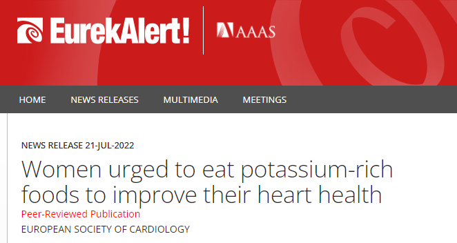 研究顯示,在近20年的隨訪期間,與鉀攝入量最低者相比,鉀攝入量最高者,心血管事件風(fēng)險降低了13%。女性心血管病發(fā)生或復(fù)發(fā)風(fēng)險降低了11%,男性降低了7%。