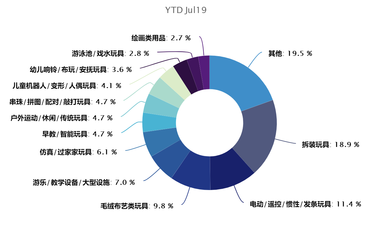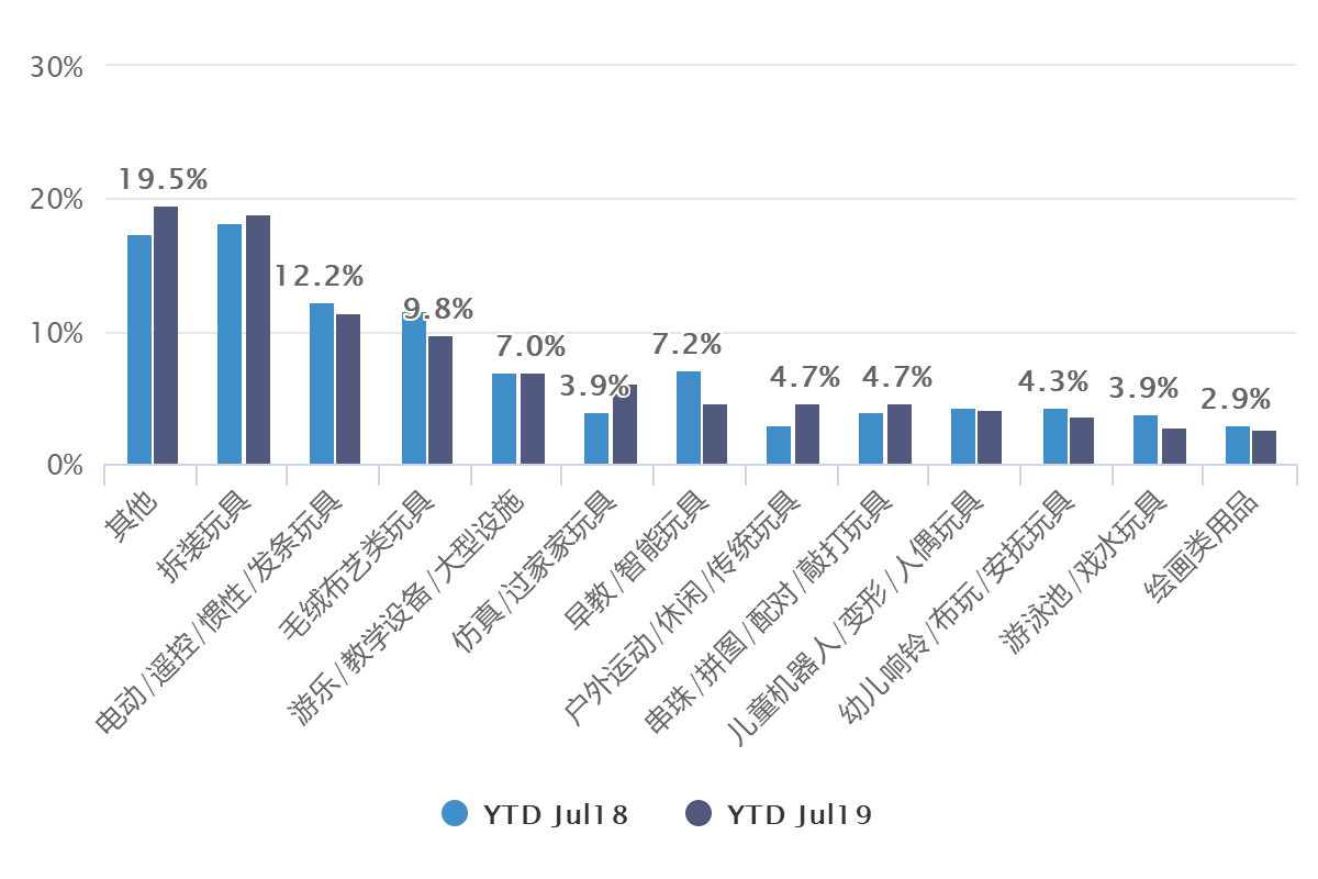 從頭部品類來看,除去其他類別,2019年拆裝玩具、電動/遙控/慣性/發(fā)條玩具、毛絨布藝類玩具牢牢掌控著前三位銷售份額,分別占比18.9%、11.4%、9.8%。