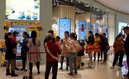 (開業(yè)約10分鐘,門店外圍“微笑豪禮”入會智能設(shè)備S形長龍)