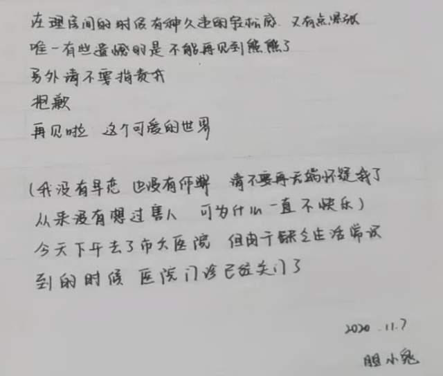 在欣欣的遺書中這樣寫著:“抱歉,再見啦,這個可愛的世界。我沒有早戀,也沒有作弊,請不要無端懷疑我了,從來沒有想過害人,可為什么一直不快樂?”