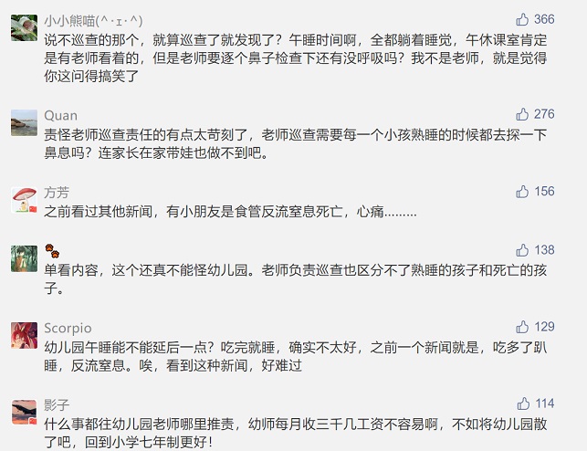 又是一朵還未開(kāi)放就凋零的花朵,網(wǎng)友們看到新聞后都很難過(guò),紛紛留言,一部分網(wǎng)友責(zé)怪幼兒園老師沒(méi)有仔細(xì)巡查,沒(méi)有及時(shí)發(fā)現(xiàn)女孩沒(méi)有了呼吸,也有一部分反駁說(shuō),不要什么事都往幼師身上推,幼師一個(gè)月3千多塊錢(qián)不容易。再說(shuō)幼師即便巡查了也難以區(qū)分孩子是睡著還是死了,這樣要求老師確實(shí)太過(guò)苛刻了。