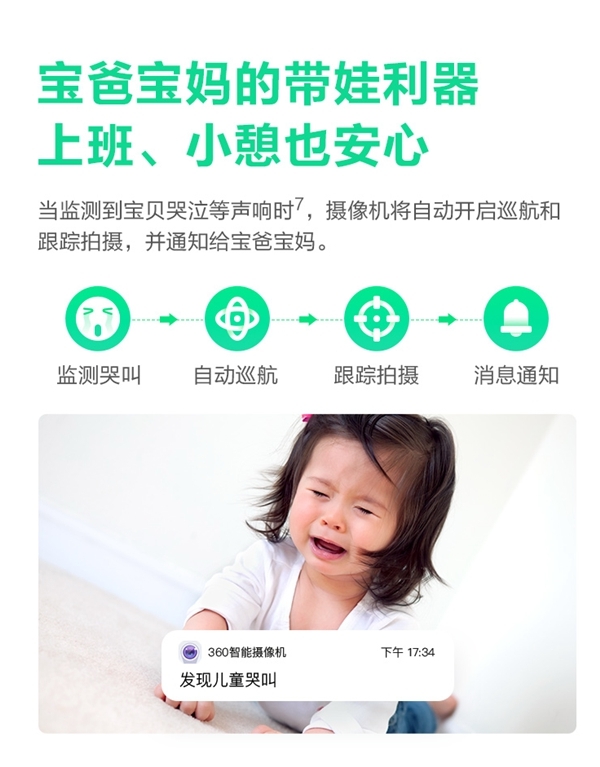 此外,360智能攝像機云臺5P觸聯(lián)2K版還增加了哭聲智能監(jiān)測。當孩子哭泣時,攝像機自動打開巡航和跟蹤拍攝功能,并在第一時間通知寶爸寶媽。如果家長不能第一時間出現(xiàn)在孩子身邊,家長還可通過手機APP為孩子挑選播放兒歌、故事等內(nèi)容,安撫孩子情緒。