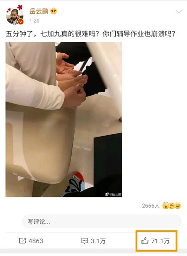 岳云鵬也發(fā)了一條微博:五分鐘了,7加9真的很難嗎?