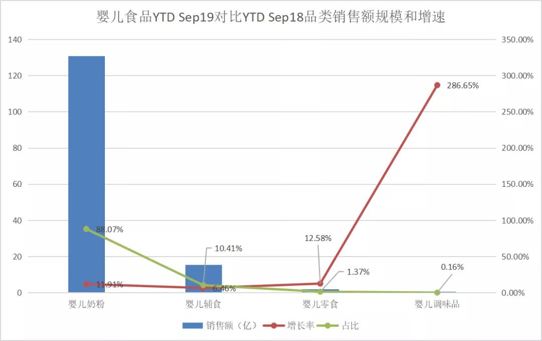 從線上全網(wǎng)銷(xiāo)售數(shù)據(jù)來(lái)看,嬰兒食品的市場(chǎng)規(guī)模已降至第四位,達(dá)148.5億,前三分別是童裝童鞋、玩具益智、尿褲尿片。同時(shí)增速也在放緩,僅高于嬰兒出行的9.3%,增長(zhǎng)速度僅11.4%。