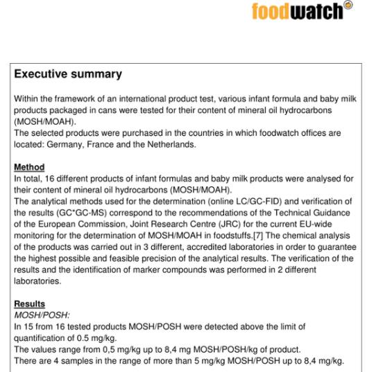 10月24日,food watch在官網(wǎng)公布了上述結(jié)果,并稱在嬰幼兒產(chǎn)品的整個(gè)生產(chǎn)鏈條中,都可能受到礦物油的污染。此次檢測(cè)發(fā)現(xiàn)的物質(zhì)為非純礦物油成分,有可能是從包裝金屬罐遷移到奶粉中的。