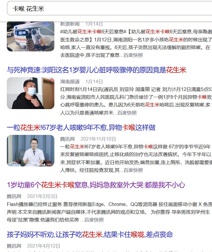 無獨(dú)有偶,1月10日,平安東勝發(fā)布了一則“小孩食物卡喉嚨,東勝民警緊急送醫(yī)”的新聞。親貝網(wǎng)百度了一下“卡喉 花生米”一下子就跳出了不少類似意外事件。