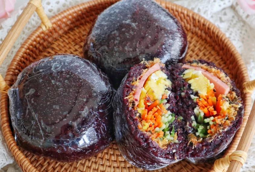 在案板上放一張保鮮膜,再放一些黑米飯,攤平整后,放上各種食材,最后一層鋪點(diǎn)黑米飯。最后用保鮮膜將黑米飯包裹起來,這樣黑米飯團(tuán)就做好了。