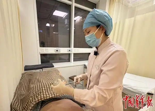 北京按摩醫(yī)院,護士正給年輕患者拔罐。中青報·中青網記者 劉昶榮/攝