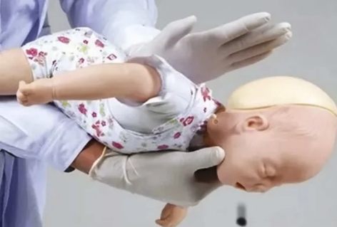 ?、僬乙粋€平穩(wěn)的地方坐下,將孩子俯身臥于大人雙腿上,對于年齡小的寶寶要用雙手固定好下顎和頭部,保證氣管呈直線狀。