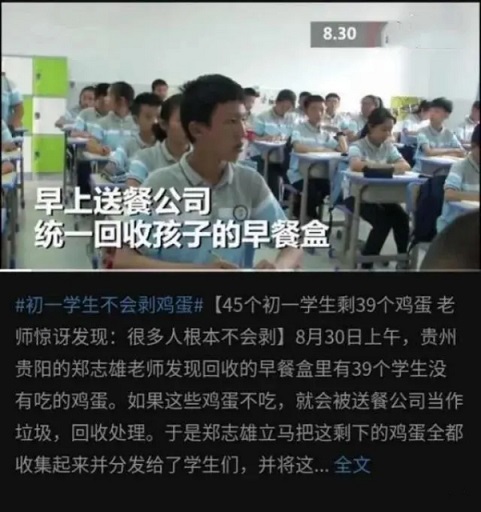 去年8月份,貴陽(yáng)的一所學(xué)校在準(zhǔn)備早餐時(shí),給每個(gè)學(xué)生都搭配了一個(gè)雞蛋??苫厥詹秃袝r(shí),老師卻發(fā)現(xiàn),全班45個(gè)學(xué)生,居然剩了39個(gè)雞蛋。老師覺得雞蛋就這樣扔掉實(shí)在太可惜了,于是就重新把雞蛋發(fā)給了學(xué)生們。
