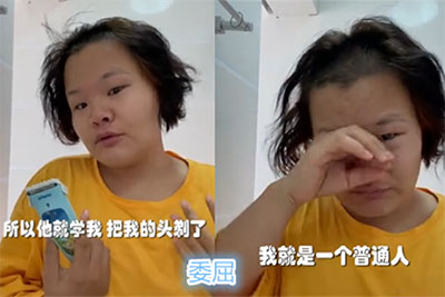 很快他就發(fā)現(xiàn)自己的頭發(fā)被剃掉了,做這件事情了,正是自己家的熊孩子。從視頻截圖可以看出,這位媽媽的臉上寫(xiě)滿了“心累”,眼圈還有些泛紅。她額頭前的頭發(fā)幾乎全部被剃掉了,光禿禿的一大片。