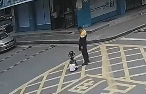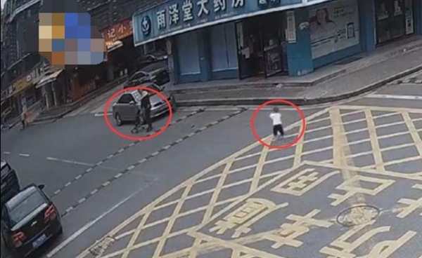 監(jiān)控顯示,這徹底激怒了爸爸,他把孩子留在路中間顧自往前走,一回頭發(fā)現(xiàn)一輛裝滿貨物的小貨車出現(xiàn)在視野中,貨車準(zhǔn)備左轉(zhuǎn)但此時(shí)左方正好有一輛直行車,孩子的位置恰好位于貨車司機(jī)的視野盲區(qū),貨車朝孩子開(kāi)去,爸爸丟下小推車飛奔回來(lái),抱起受傷的孩子。所幸司機(jī)反應(yīng)及時(shí),孩子僅被擦碰了一下,無(wú)大礙。