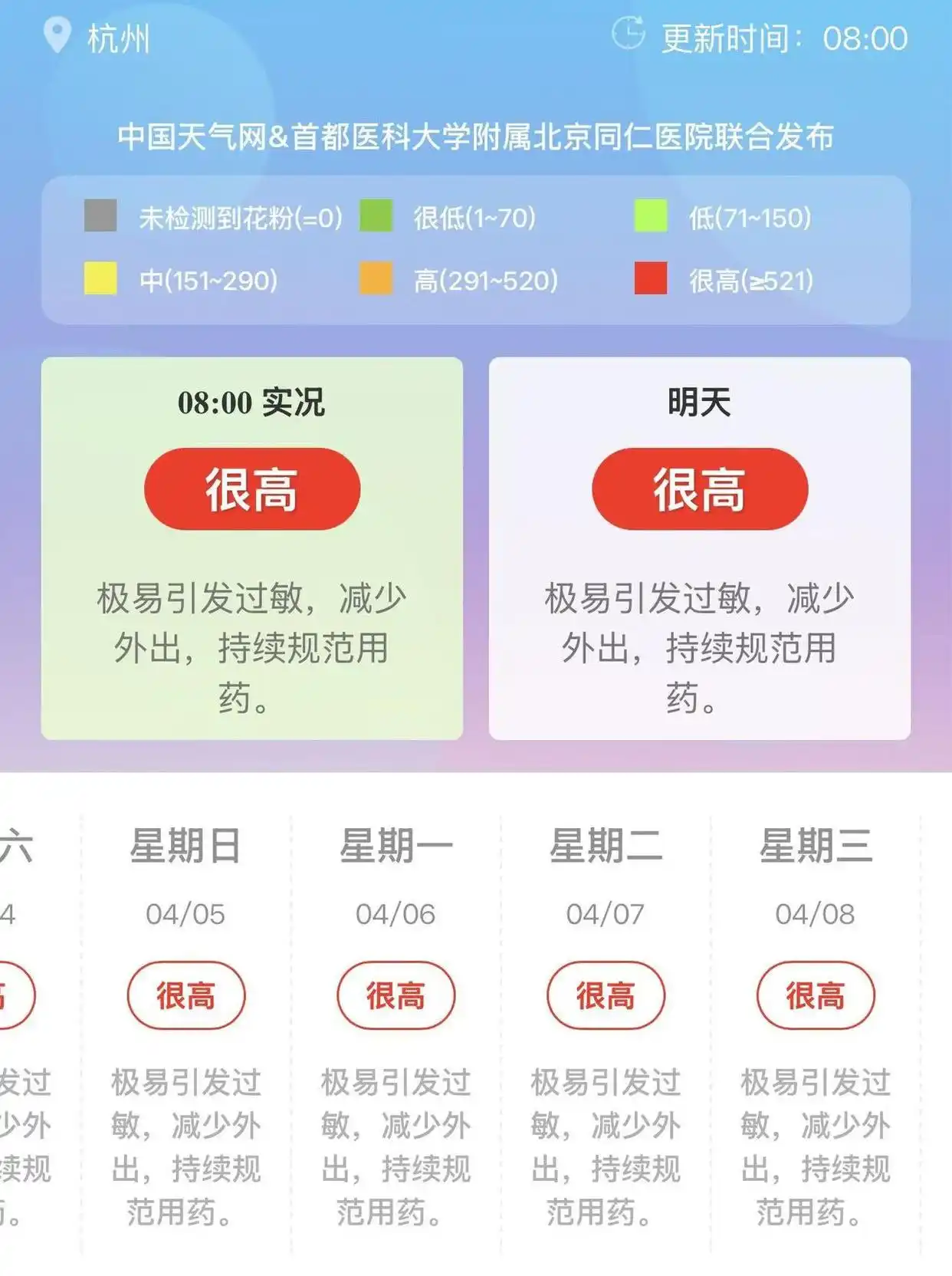 目前,杭州已經(jīng)有了花粉指數(shù),在“中國(guó)天氣網(wǎng)”微信小程序里每日更新,由杭州市第一人民醫(yī)院耳鼻喉科團(tuán)隊(duì)負(fù)責(zé)監(jiān)測(cè)。