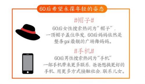 60后女性最愛搜索的品類是“帽子”,她們希望藏住一頭華發(fā)的小心思里,或許也藏起了媽媽們希望永葆青春的期盼;60后男性對(duì)“手機(jī)”的搜索偏好,可能未必證明數(shù)碼產(chǎn)品和性別氣質(zhì)之間的天然興趣關(guān)聯(lián),卻能凸顯爸爸們不服老、不愿與社會(huì)科技進(jìn)步浪潮脫節(jié),卻也想同時(shí)和子女更多地增強(qiáng)聯(lián)絡(luò)、溝通交流并建立更多共同話題的努力用心。