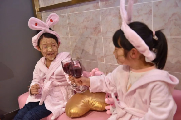 最有趣的要數寶寶SPA體驗了。只見寶寶們換上了粉色的浴袍,小腳泡進了粉色的洗腳桶,戴上粉色的發(fā)帶,小臉上再貼上黃瓜片,活脫脫的精致小公主啊!手上再拿著高腳杯裝著的葡萄汁,和小伙伴一起碰杯,一同快樂~