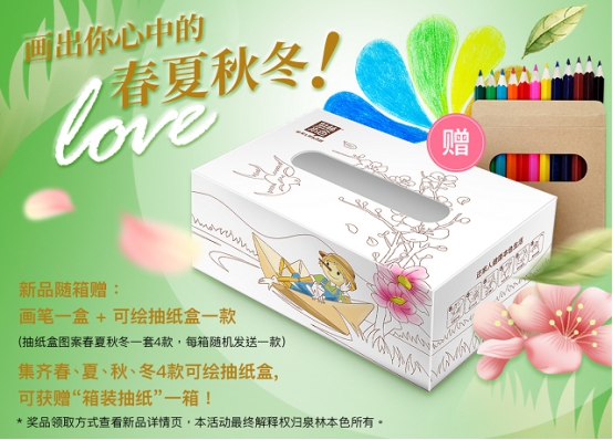 購買泉林本色“田美系列”新品的用戶將額外獲贈可以疊成紙盒的紙卡和一套畫筆,收到產(chǎn)品的顧客可以在紙卡上和孩子一起彩繪出各自心中的四季,這種玩法增強(qiáng)了家人之間的互動同時開發(fā)了孩子的動手能力,將產(chǎn)品的實(shí)用性和趣味性完美結(jié)合。