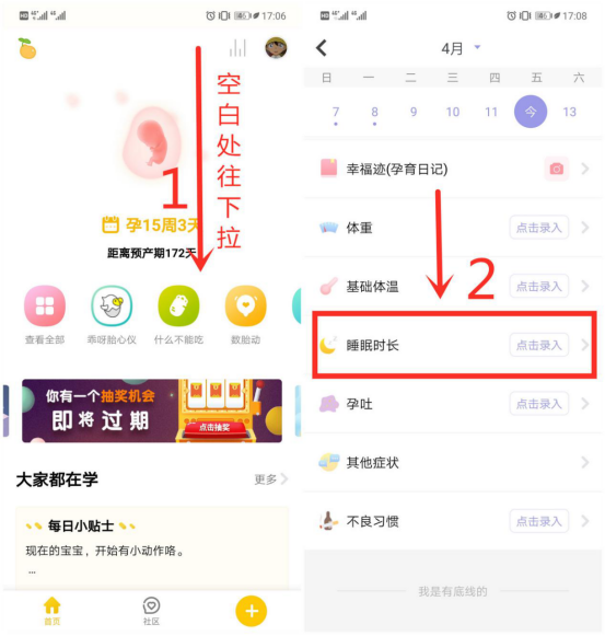 第1步:在孕跡暖暖APP首頁(yè)空白處往下拉,即可進(jìn)入日歷。日歷中匯總了眾多與孕媽孕期生活及產(chǎn)檢相關(guān)的記錄項(xiàng)。在日歷中找到“睡眠時(shí)長(zhǎng)”項(xiàng),點(diǎn)擊即可選擇睡眠時(shí)長(zhǎng)。如下圖:
