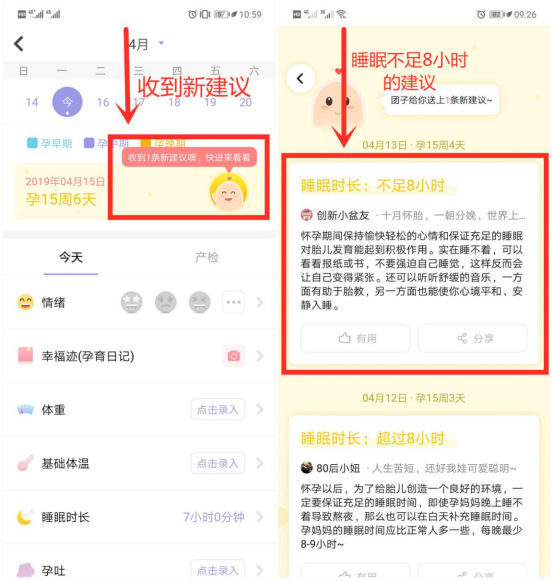 第2步:在記錄完成后,我們會(huì)看到右上角的團(tuán)子展示一句溫馨提醒:收到1條小建議噢,快進(jìn)來(lái)看看。點(diǎn)擊之后,即可看到APP根據(jù)剛才記錄的睡眠情況給出不同的建議。如下圖: