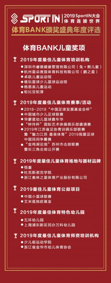 此次大會還揭曉了2019年度體育產(chǎn)業(yè)大獎,包括年度金獎類、賽事類、投資類、兒童體育類四大類共計37項大獎。據(jù)悉,本次評選是經(jīng)過組委會,依托媒體影響力,智庫調(diào)研,專家評審等方式進行的行業(yè)調(diào)研和深度訪談而產(chǎn)生,確保了參評項目的廣泛性及評選結(jié)果的專業(yè)性,以下為兒童獎項榜單。