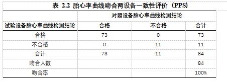 根據(jù)《中華圍產(chǎn)醫(yī)學(xué)》規(guī)定的改良Fischer評(píng)分法判定標(biāo)準(zhǔn),評(píng)分≤4分為陽(yáng)性(胎兒缺氧),5-7分(包含5和7)為可疑,8-10(包含8和10)分為陰性(胎兒正常)。當(dāng)試驗(yàn)設(shè)備與對(duì)照設(shè)備同步比較胎心率的監(jiān)測(cè)結(jié)果同時(shí)在≤4分或5-7分或8-10分的有效監(jiān)測(cè)結(jié)果的范圍內(nèi),則判定同步比較胎心率的監(jiān)測(cè)結(jié)果為一致;反之,當(dāng)監(jiān)測(cè)結(jié)果不是同時(shí)在≤4分或5-7分或8-10分的有效監(jiān)測(cè)結(jié)果的范圍內(nèi),則判定同步比較胎心率的監(jiān)測(cè)結(jié)果為不一致。