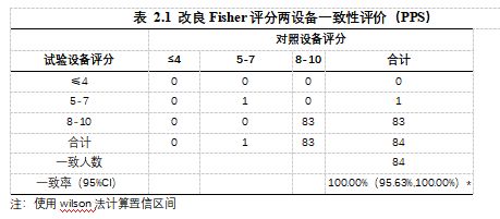 試驗(yàn)設(shè)備與對(duì)照設(shè)備改良Fisher評(píng)分一致率的雙側(cè)95%置信區(qū)間的下限為95.63%,大于預(yù)定目標(biāo)值85%,說(shuō)明試驗(yàn)設(shè)備與對(duì)照設(shè)備一致性達(dá)到要求。見(jiàn)表2.1。