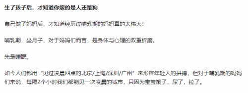 當(dāng)事人提到,哺乳期,坐月子,對于媽媽們而言,是身體與心理的雙重折磨。睡眠稀缺,每隔2個小時都能見一次凌晨的城市,只因為寶寶餓了,尿了,拉了;漲奶疼痛,痛到牙關(guān)緊咬,心臟收緊,冷汗直冒,卻還是沒有辦法得到一丁點緩解。
