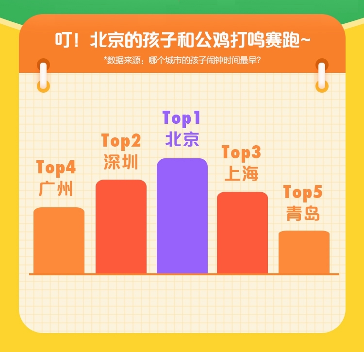 “起得比雞早,睡得比狗晚。”很多北京當(dāng)?shù)睾⒆?,喜歡用這句話來(lái)自嘲和調(diào)侃。不過,報(bào)告也確實(shí)反映了一部分事實(shí)。360兒童手表大數(shù)據(jù)顯示,北京孩子的鬧鐘時(shí)間最早,其后依次才是深圳、上海、廣州和青島。換句話說,北京孩子簡(jiǎn)直是在和公雞打鳴賽跑。