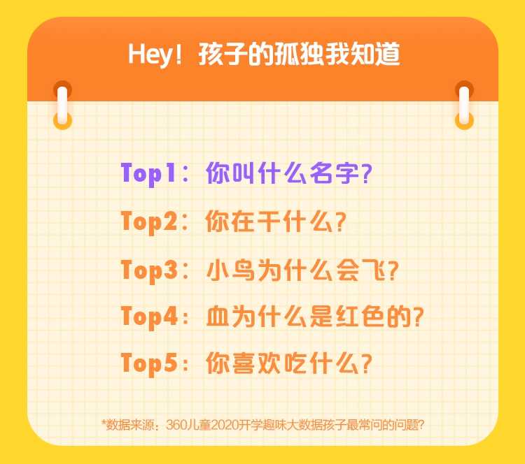 好奇是孩子的天性,處于青春爛漫的孩提時(shí)代,孩子們的內(nèi)心更是充滿無(wú)數(shù)問號(hào)。360兒童手表大數(shù)據(jù)顯示,孩子最常問的五個(gè)問題依次是,“你叫什么名字?”“你在干什么?”“小鳥為什么會(huì)飛?”“血為什么是紅色的?”“你喜歡吃什么?”其中,“你叫什么名字”,成為了孩子們最常提問的問題。這一方面反映了孩子們的好奇心,但不得不注意的是另一方面也折射出孩子們內(nèi)心的孤獨(dú)感以及對(duì)親情、友情的向往。