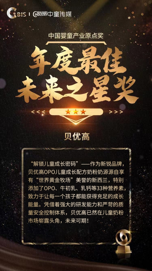 2020年12月13日至14日,由中童傳媒舉辦的第七屆中國嬰童產(chǎn)業(yè)大會(CBIS)在北京舉辦。這是目前國內(nèi)嬰童行業(yè)規(guī)格最高、最具權(quán)威性以及影響力的產(chǎn)業(yè)大會。貝優(yōu)高及嬰童各細(xì)分行業(yè)的中堅品牌悉數(shù)亮相。在大會當(dāng)晚舉辦的2020年中國嬰童產(chǎn)業(yè)原點(diǎn)獎頒獎典禮上,貝優(yōu)高憑借強(qiáng)勁的品牌實(shí)力與市場口碑,榮獲年度嬰童產(chǎn)業(yè)力量最高榮譽(yù)——嬰童產(chǎn)業(yè)原點(diǎn)獎暨年度最佳未來之星獎。