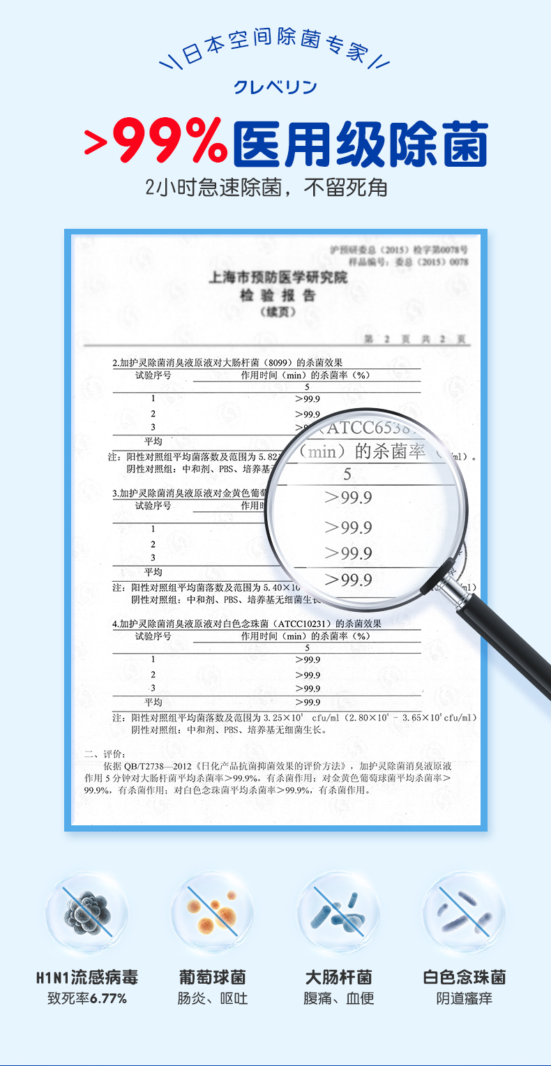 據(jù)權(quán)威第三方檢測(cè)機(jī)構(gòu)報(bào)告顯示,在24小時(shí)內(nèi),加護(hù)靈針對(duì)甲醛、H1N1流感病毒、大腸桿菌、金黃色葡萄球菌及異味等室內(nèi)空氣污染物消除率可達(dá)99%。我國(guó)復(fù)旦大學(xué)同加護(hù)靈開展BSL-3實(shí)驗(yàn)項(xiàng)目中,結(jié)果顯示加護(hù)靈可以有效去除空氣中99.9%的H7N9病毒。