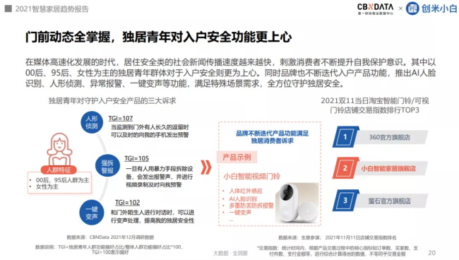 頻發(fā)的獨居被害案件,讓獨居群體的安全意識也更加強烈,尤其是以00后、95后、女性為主的獨居青年群體,他們對智慧入戶單品的功能需求偏好前三分別是人形偵測、異常警報、一鍵變聲功能。