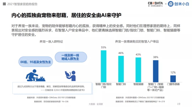 其中,養(yǎng)寵一族多以00后、95后及女性人群為主,更多居住一線及新一線城市。寵物對他們而言是陪伴自己、提供精神慰藉的朋友,而他們也非常關(guān)注居住的安全問題,傾向于選擇智能門鎖/指紋門鎖、智能門鈴、智能貓眼等智慧入戶單品。