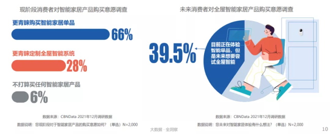 根據(jù)CBNData調(diào)研數(shù)據(jù)顯示,現(xiàn)階段有超六成消費者更青睞購買智能家居單品,相較于全屋智能定制,智能單品憑借低單價、高迭代、高試錯空間等特點,更容易被消費者種草。同時消費者需求仍不斷升級,其中有將近40%的消費者表示,雖然現(xiàn)階段處于智能單品體驗期,但未來仍想要嘗試全屋智能系統(tǒng)。