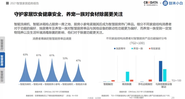 而在廚房領(lǐng)域,智能洗碗機、智能冰箱與智能廚房小家電是熱門單品。不同家庭結(jié)構(gòu)當中,養(yǎng)寵一族對食物的除菌功能更為關(guān)注。