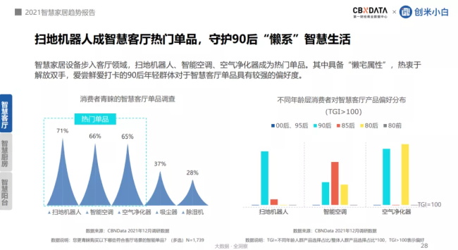 當智慧家居設(shè)備進入客廳、廚房、陽臺等不同空間,一場解放雙手的品質(zhì)生活大變革也拉開帷幕。根據(jù)CBNData《報告》顯示,智慧客廳單品當中,掃地機器人、智能空調(diào)、空氣凈化器最為熱門。相較其他代際,熱愛嘗鮮的90后對智慧客廳產(chǎn)品的偏好度更強。