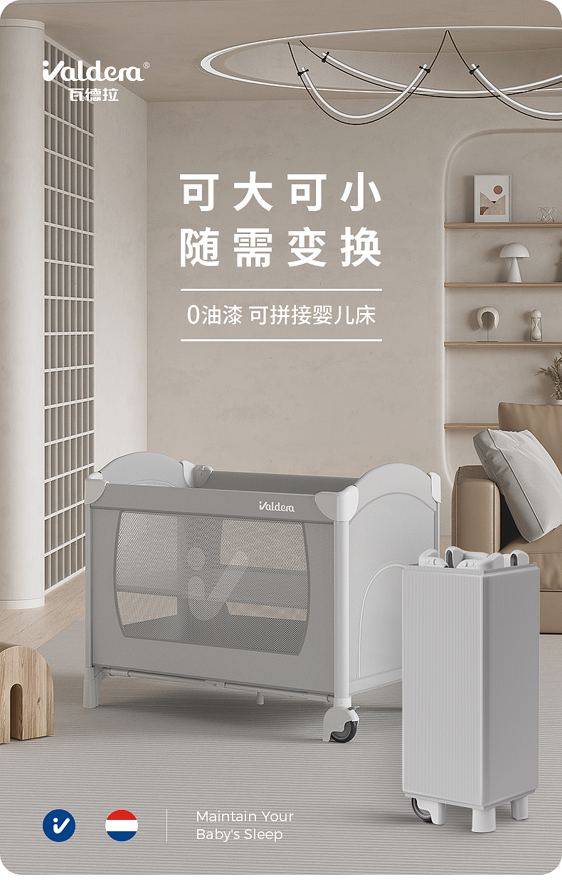 通過(guò)不斷的市場(chǎng)調(diào)研和用戶(hù)的使用反饋,Valdera發(fā)現(xiàn)用戶(hù)對(duì)于嬰兒床的安全性和便捷性愈發(fā)重視,傳統(tǒng)的木質(zhì)嬰兒床存在的油漆甲醛風(fēng)險(xiǎn)讓寶爸寶媽們?cè)桨l(fā)擔(dān)心,同時(shí)木質(zhì)嬰兒床安裝繁瑣,攜帶不便的特點(diǎn)已無(wú)法滿(mǎn)足新時(shí)代寶爸寶媽的使用需。