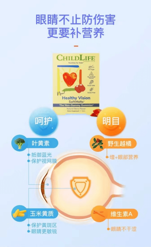 但很多孩子存在挑食、飲食不均衡等問(wèn)題,無(wú)法足量、全面攝入各種營(yíng)養(yǎng)元素。家長(zhǎng)們就可以給孩子額外補(bǔ)充,ChildLife 護(hù)眼小布丁就是一個(gè)不錯(cuò)的選擇,所需營(yíng)養(yǎng)元素一顆就能滿足,讓孩子輕松攝取。因?yàn)槊款wChildLife護(hù)眼小布丁含有5mg葉黃素、1mg 玉米黃質(zhì) 、200mcg 維生素A和10mg北歐野生越橘,相當(dāng)于143g的西蘭花葉黃素、99根玉米的玉米黃質(zhì)、4根胡蘿卜的維生素A和數(shù)百顆越橘提取物。