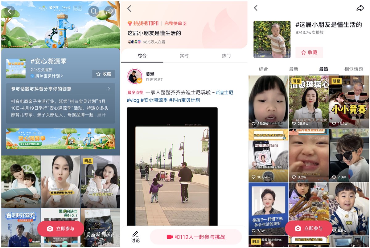 此次活動(dòng)沿著活動(dòng)官方線上主話(huà)題#安心溯源季 的傳播路徑,進(jìn)一步打造細(xì)分互動(dòng)話(huà)題—— #這屆小朋友是懂生活的,突破傳統(tǒng)視頻單一的種草、科普形式,與眾多頭部育兒專(zhuān)家、親子頭部達(dá)人、母嬰品牌一起形成傳播矩陣,以抖音短視頻加趣味的戲劇化場(chǎng)景演繹,如百萬(wàn)粉絲達(dá)人@我們的孩兒、明星達(dá)人涂磊、曹穎等等,不僅分享自己的選購(gòu)經(jīng)驗(yàn)也展示了日常中有趣好玩的育兒經(jīng)驗(yàn),無(wú)形中調(diào)動(dòng)起母嬰群體對(duì)話(huà)題#這屆小朋友是懂生活的 熱烈的討論和推廣,讓用戶(hù)自發(fā)產(chǎn)生高水準(zhǔn)的UGC創(chuàng)作內(nèi)容,高效達(dá)成此次活動(dòng)在母嬰圈層的多元占位與心智占領(lǐng),催化活動(dòng)“流量+內(nèi)容”的雙向驅(qū)動(dòng)。據(jù)悉,該互動(dòng)話(huà)題最終成功登上抖音挑戰(zhàn)榜第11位,話(huà)題熱度和曝光量已突破9743.7萬(wàn),且還在持續(xù)升溫中。