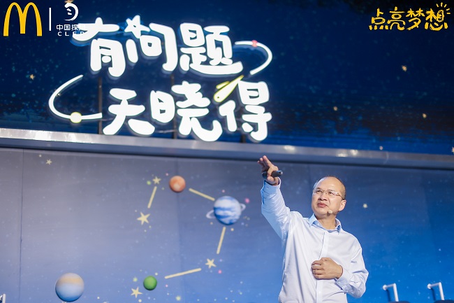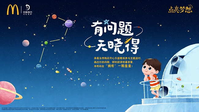 目前麥當(dāng)勞“點(diǎn)亮夢(mèng)想”活動(dòng)與“中國(guó)探月”的合作已經(jīng)邁進(jìn)第四年。四年來圍繞“航天+教育”的大主題,雙方共同將國(guó)家頂級(jí)的航天資源帶到孩子們的身邊,致力于為孩子們提供沉浸式的航天體驗(yàn)。但在多年的“點(diǎn)亮夢(mèng)想”航天科普中,麥當(dāng)勞中國(guó)也接收到了來自孩子們的無窮提問 ——“宇宙那么大,會(huì)迷路嗎?”“外星人真的存在嗎?”“我將來可以去到太空,成為一顆小行星的主人嗎?”成長(zhǎng)中的孩子,總會(huì)問出這些令家長(zhǎng)們難以回答的問題。麥當(dāng)勞發(fā)現(xiàn)不少家長(zhǎng)們常常以“天曉得”加以應(yīng)付,但這樣的回答,很可能讓我們錯(cuò)失了一位未來的天才。