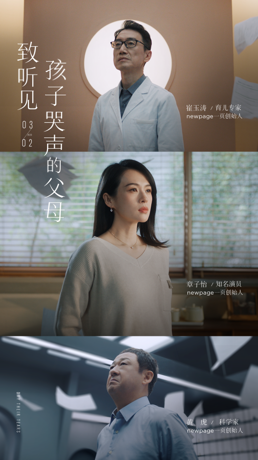 2023年3月,newpage一頁重磅發(fā)布品牌campaign《致聽見孩子哭聲的父母》。在品牌故事片中,知名演員章子怡,育兒專家崔玉濤以及科學家黃虎博士三位創(chuàng)始人,分別從母親的愛、育兒專家臨床經(jīng)驗以及科研人員研發(fā)創(chuàng)新三個維度賦能品牌,助力萬千家長回應“孩子的哭聲”。