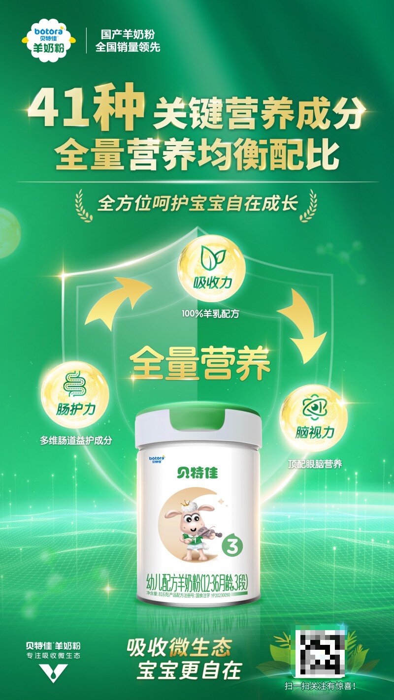 養(yǎng)娃路上,每天都會(huì)遇到新的挑戰(zhàn),但有貝特佳嬰幼兒配方羊奶粉守住營(yíng)養(yǎng)吸收大關(guān),寶寶們就獲得了腸胃健康增益buff,體質(zhì)強(qiáng)健快樂(lè)成長(zhǎng)。未來(lái),貝特佳會(huì)繼續(xù)以寶寶真實(shí)需求為依托,深耕科學(xué)配方,專注腸胃健康和吸收,進(jìn)一步提高產(chǎn)品品質(zhì)和品牌影響力,以全量營(yíng)養(yǎng)賦能寶貝腸胃輕松健康成長(zhǎng)。