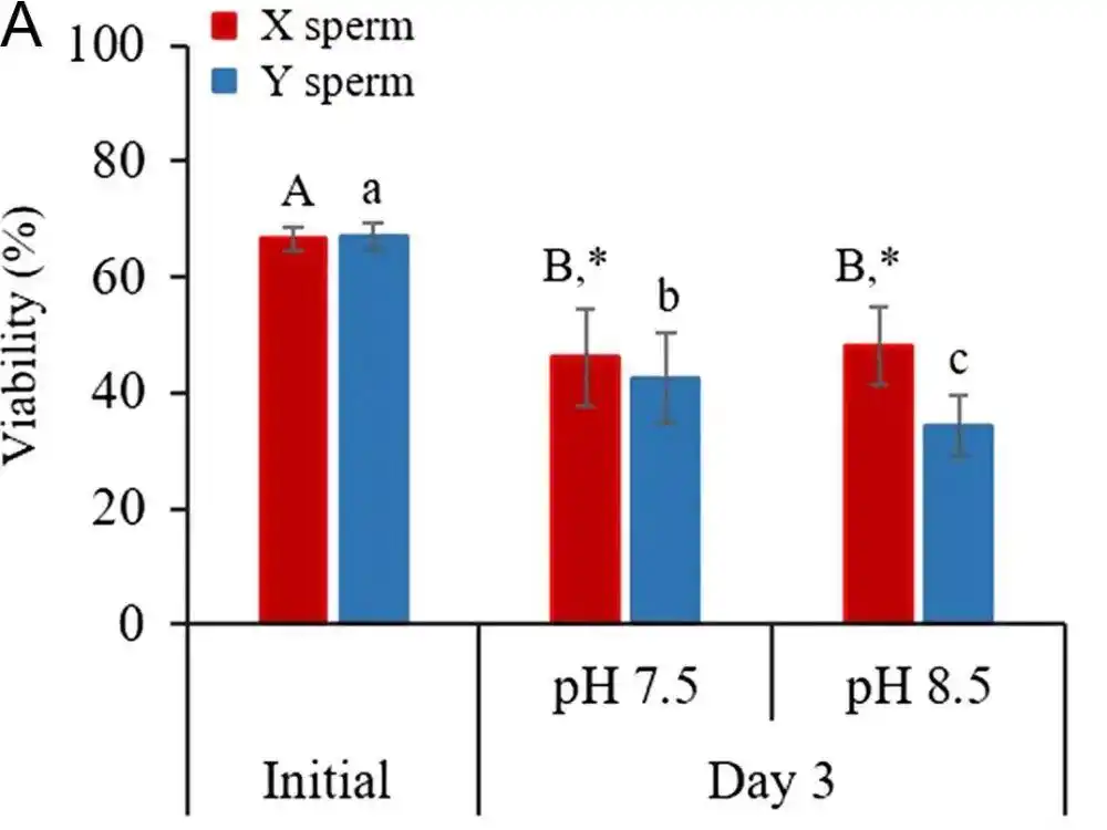 培育三天后,精子的活力均低于初始值,Y精子的活力均低于X精子,pH8.5環(huán)境下的Y精子活力降低更顯著。圖片來自參考文獻(xiàn)[11]