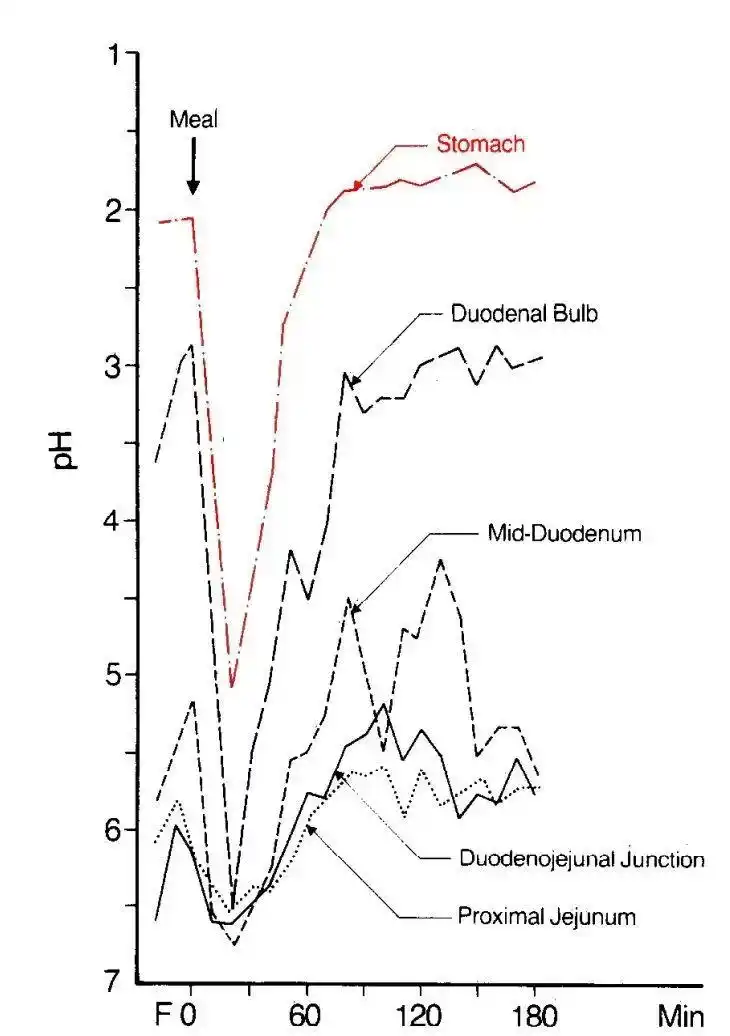 圖片來自參考文獻(xiàn) [4],紅色曲線顯示健康成年人進(jìn)食后胃部的 pH 值短暫升高,60 分鐘左右時恢復(fù)到 2 以下